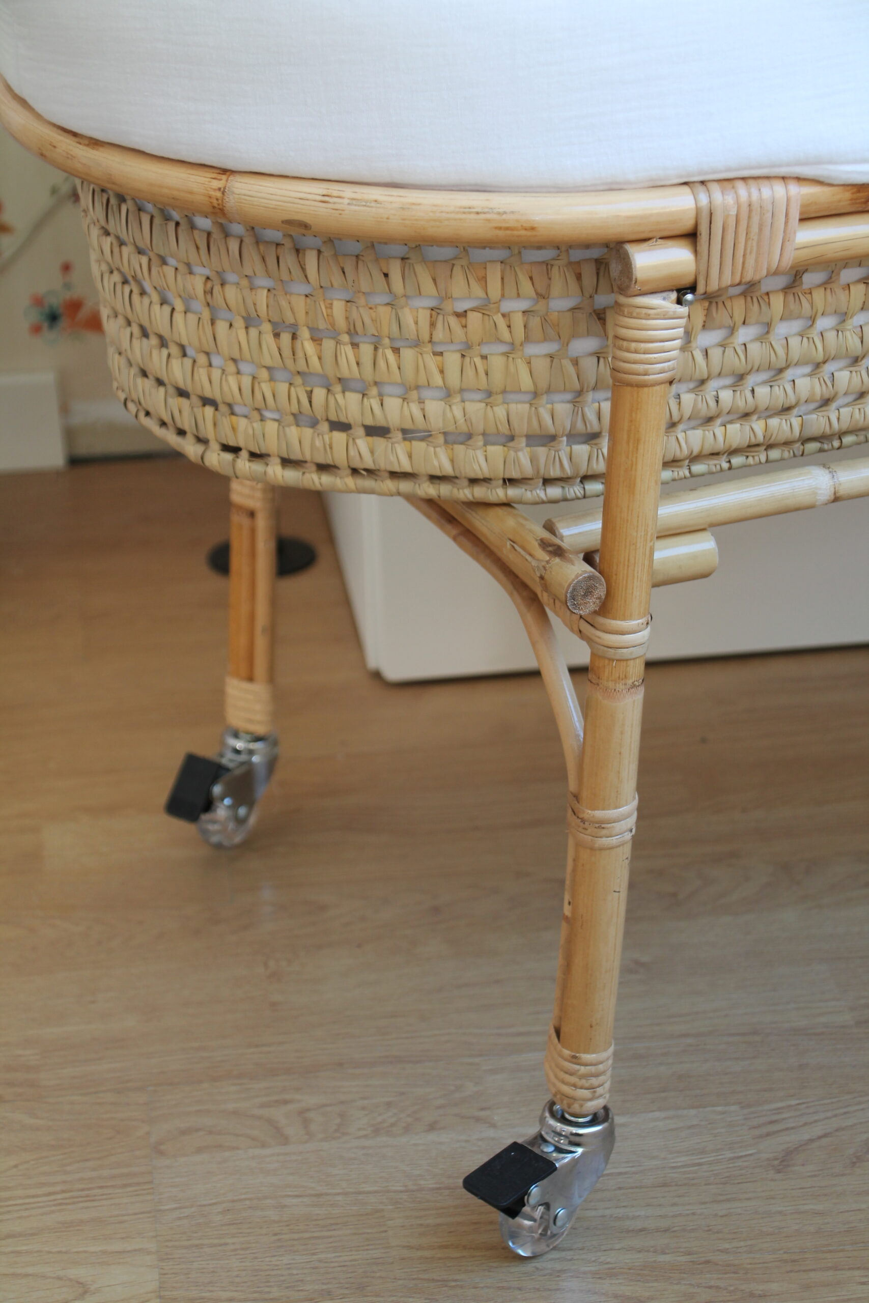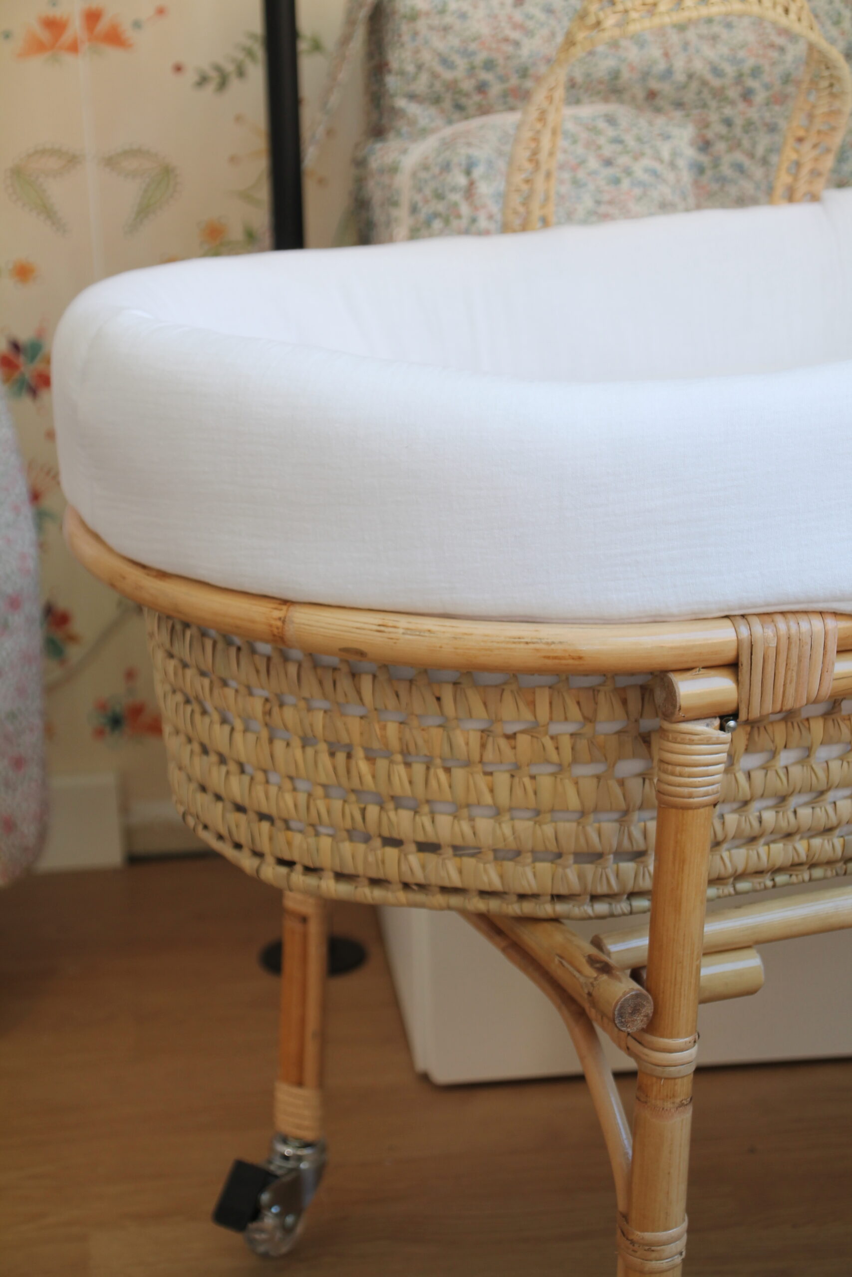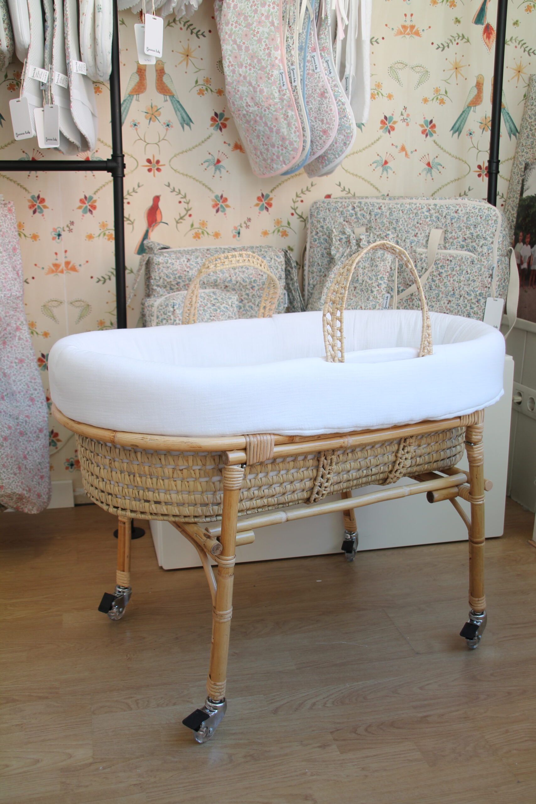 Moisés Básico: Incluye el capazo de mimbre y las patas plegables con ruedas.
