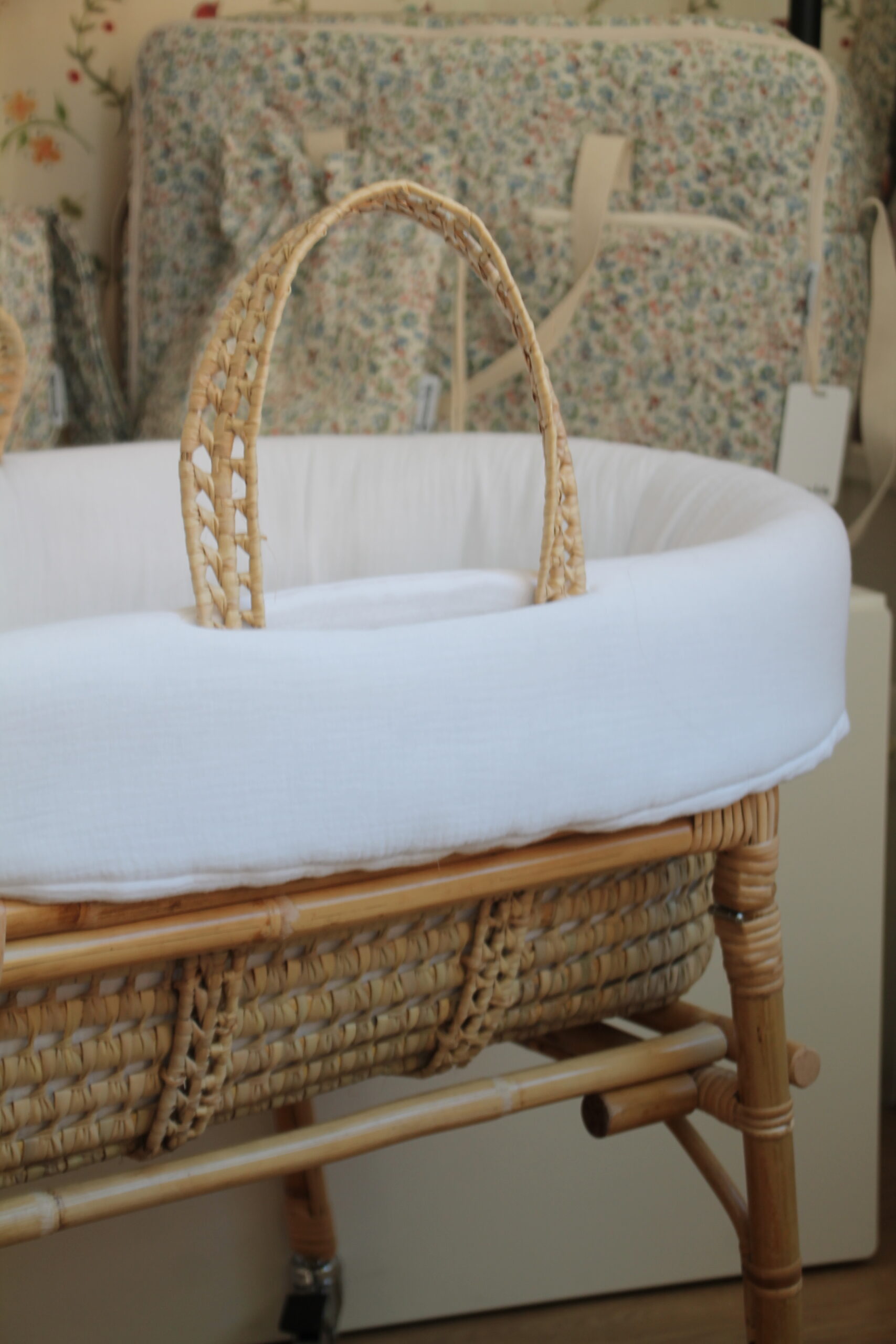Se compone de dos piezas independientes: un capazo de mimbre trenzado a mano y unas patas plegables de junco que permiten guardarlo fácilmente cuando no esté en uso. Permite una movilidad total gracias a sus ruedas integradas, podrás desplazar el moisés por toda la casa para tener a tu bebé siempre cerca, ya sea en el salón durante el día o junto a tu cama por la noche. Su uso está recomendado desde el nacimiento hasta los 3 o 4 meses (o hasta que el bebé empiece a incorporarse por sí solo).